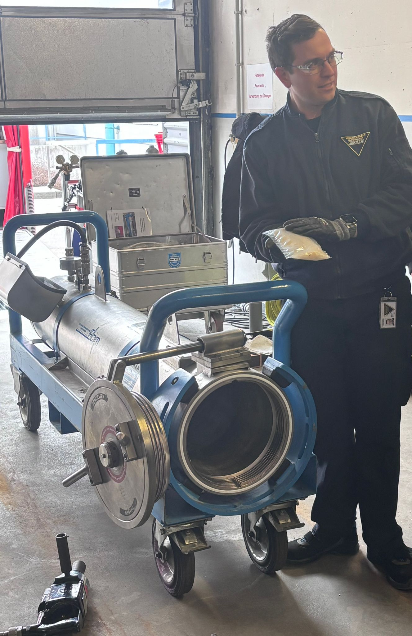 Nach der Vorstellung verschiedener Spezialgeräte ging es direkt in die Praxis. Zum Einsatz kamen unter anderem ein Flaschenbergegerät für havarierte Druckgasflaschen sowie der sogenannte „Fassknacker“, mit dem Transportbehälter kontrolliert druckentlastet werden können.
